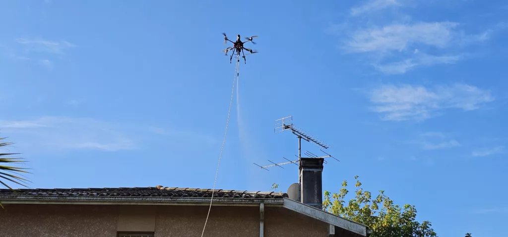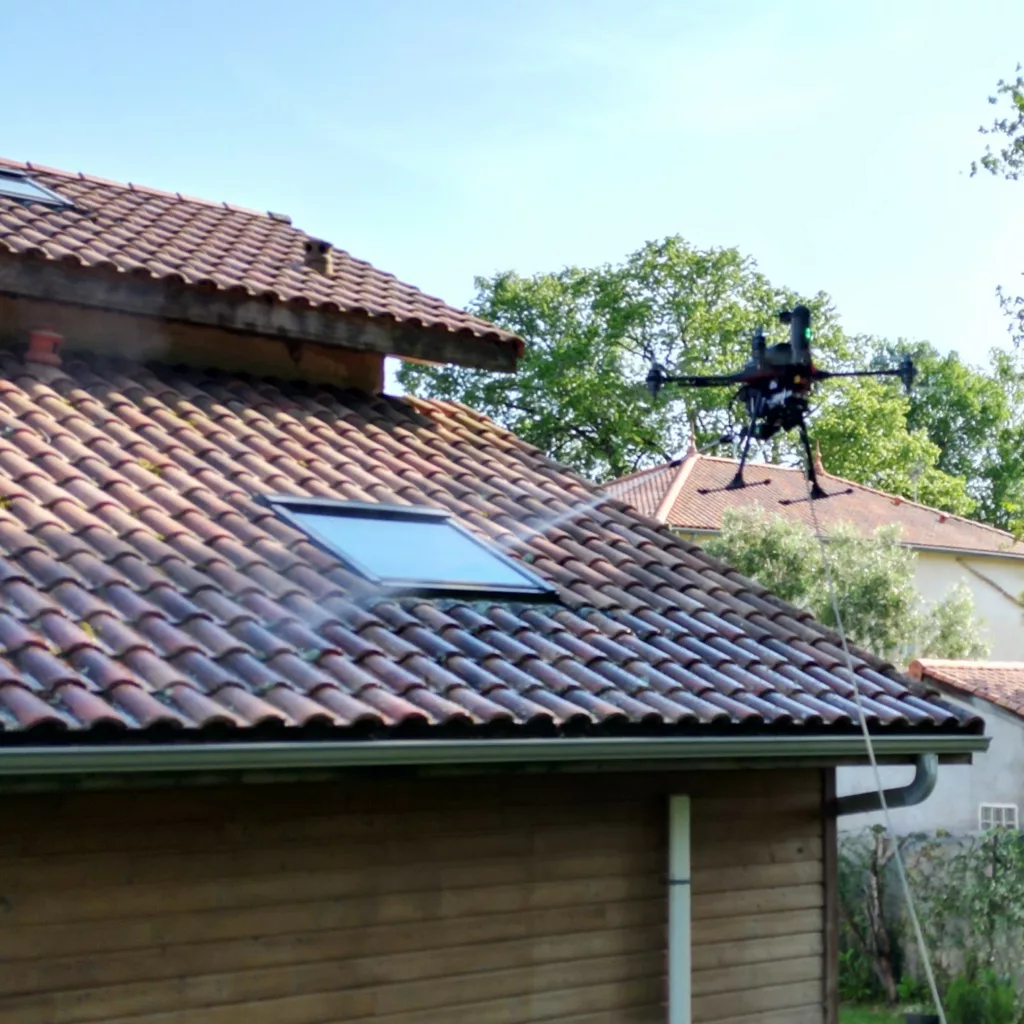 Le drone permet d’effectuer un démoussage et un nettoyage complet de votre toiture par les airs.